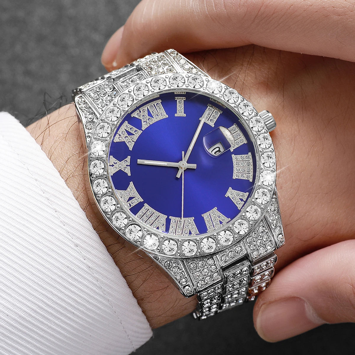 Command the room with the ultimate symbol of prestige. This stunning "Full Diamond" timepiece is encrusted with high-clarity rhinestones, delivering a brilliant, multi-dimensional sparkle that demands attention. Featuring a classic Roman numeral dial and a functional date calendar, it’s the perfect fusion of bold streetwear luxury and timeless watchmaking.
